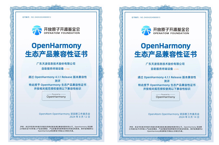 近日,天波两款自助服务终端C1B、C1P顺利通过测评,获得OpenHarmony生态产品兼容性证书,标志着天波终端产品正式接入鸿蒙生态系统,具备高协同性、高安全性、强定制能力等优势。