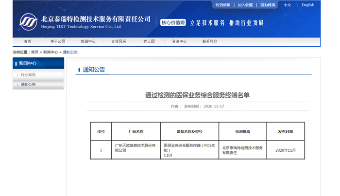2020年11月,广东天波医保码刷脸结算终端C10T经国家医保局认证测试机构检测评定,成为国家首批医保业务综合服务终端过检产品。