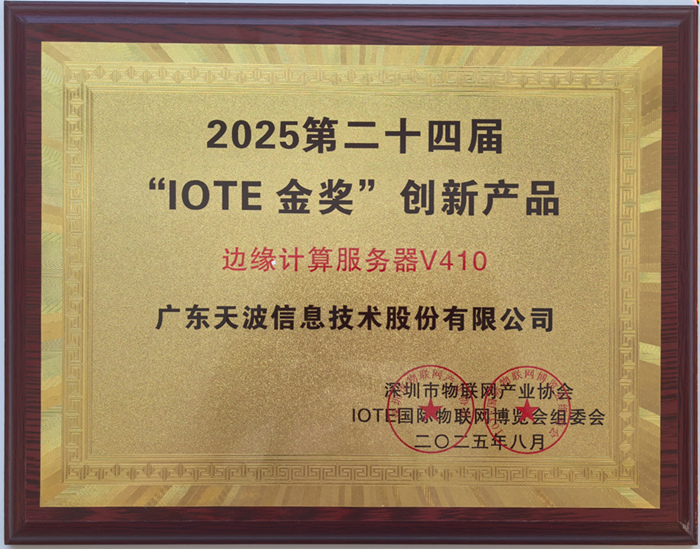 全球物联网领域最具影响力的创新评选之一,IOTE 金奖 2025创新产品评选结果于8月正式揭榜,广东天波信息技术股份有限公司(简称 “天波信息”)凭借AI边缘计算服务器V410,荣膺“IOTE金奖2025创新产品”的「AI、视觉、边缘计算类」奖项。